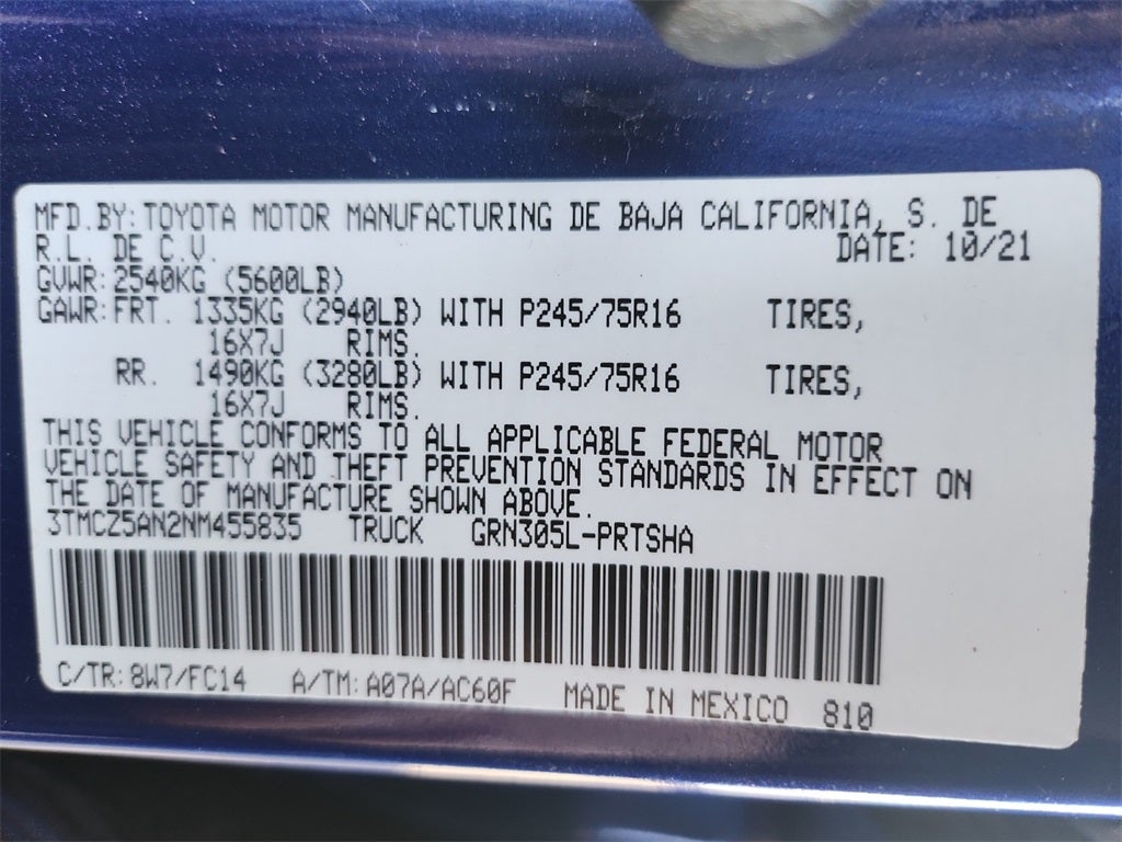 - Vehicle Name: Toyota Tacoma 4WD